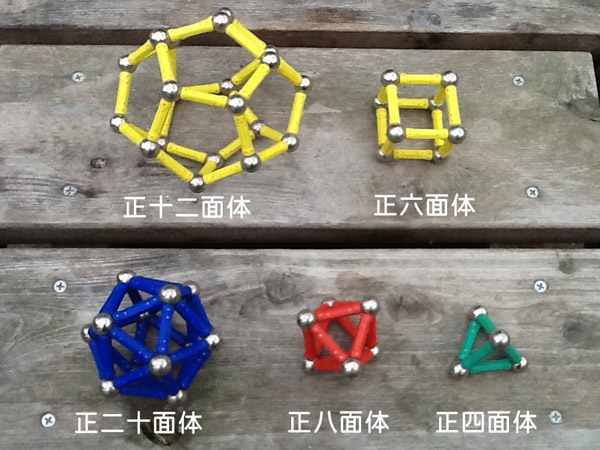 黄色の「正十二面体」と「正六面体」は、不安定で歪んでいますが、その他の多角形は、三角形の面をしているため安定しています。